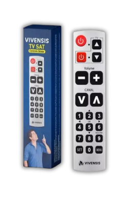 Controle remoto desenvolvido para facilidade de uso, ideal para idosos, com botões grandes e operação simplificada.